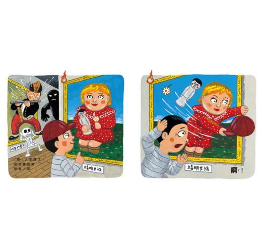 對於名畫不熟悉的幼兒讀者,也可以看這本繪本看得很開心。首先,畫裡的角色和景物不時脫框演出和人群互動,就令人驚奇; 譬如「河童的吶喊」中的河童探出頭來,嚇著了參觀者。當中,主角小男孩的帽子,被「精明女孩」給拿走,畫中的小女孩還逃跑了呢!小讀者可以跟著男孩,玩一場找回帽子的追逐戲。至於繪本的結尾,畫家百目幫小女孩畫上一頂帽子,結束了這場鬧劇,也是「畫家」與「畫作」這個主題之下,才能玩的點子,很溫馨。