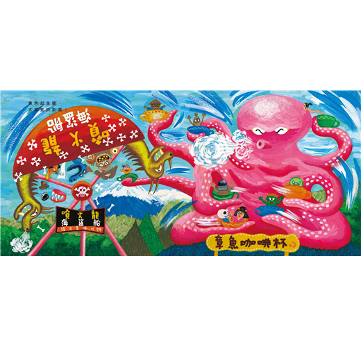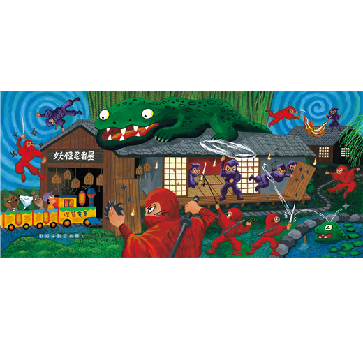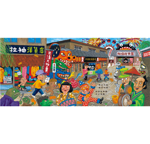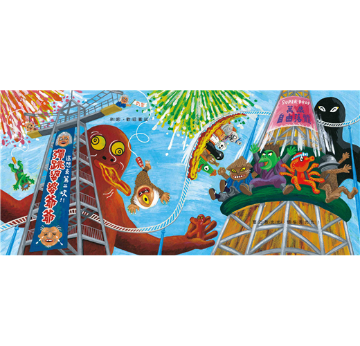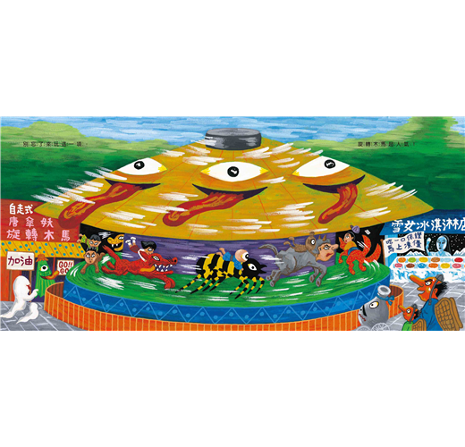 接下來的十個跨頁,廣瀨以各種妖怪獨特的造型與特性,設計了一款又一款的遊樂園設施,由大蛇來疾駛雲霄飛車、章魚來運轉咖啡杯、唐傘妖來操控旋轉木馬,是不是在你的意料之外呢?什麼,還有獨眼怪摩天輪、人面賽車、鋼索自行車,和婆婆爺爺彈跳?!只能說廣瀨克也的奇思異想真是無極限,加上動感十足的畫面,妖怪們玩樂時活潑的肢體動作與生動的表情,在在讓人目不暇給。這是一本可以反覆閱讀,每次都有新發現的繪本。