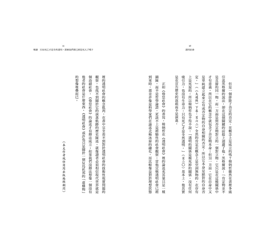 「透明社會」是個相當聳人聽聞的術語。當人們像草履蟲一樣在顯微鏡底下被觀察而無所遁形,那應該會是個恐怖電影的經典場景。更恐怖的是,哲學家韓炳哲主張說,透明性是個系統性的衝動,它會把整個社會歷程捲進去,進而顛覆整個歷程。透明性的要求更使我們變成了可見性的奴隸,透明社會也就成了色情的、展示的社會。它同時也表現為一個集體監控的社會。如果它是個結構性的動力,是個必然的歷程,那麼真的會令人不寒而慄。
