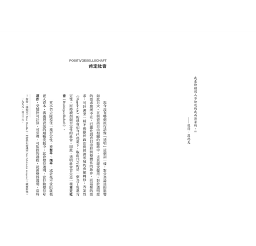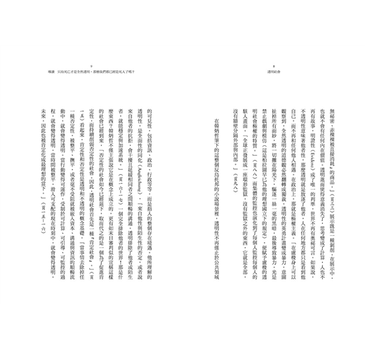 ‧透明主宰之處,沒有信任存在的空間。「透明創造信任」,事實上應該叫作「透明銷毀信任」。正是信任消失了,要求透明的聲量才會變大。社會一旦建立在信任上,絕不會冒失地要求透明。