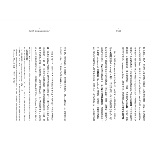 現今沒有哪個流行語像「透明」這個詞一樣,對公共論述的影響如此巨大。在與資訊自由相關的脈絡中,尤其廣受援用。對於透明度的要求無所不在,已激化到盲目崇拜與整體化的地步,而這樣的要求,可回溯至一種不侷限於政治與經濟領域的典範轉移。否定性(Negativität)的社會如今已經退下,取而代之的是一個為了促進肯定性,而持續削弱否定性的社會。因此,透明社會首先是一種肯定社會(Positivgesellschaft)。