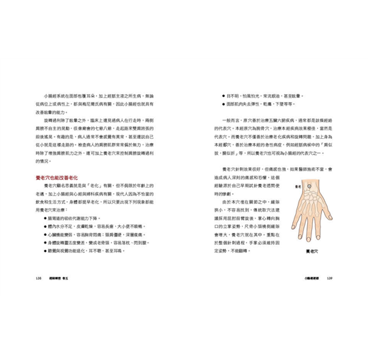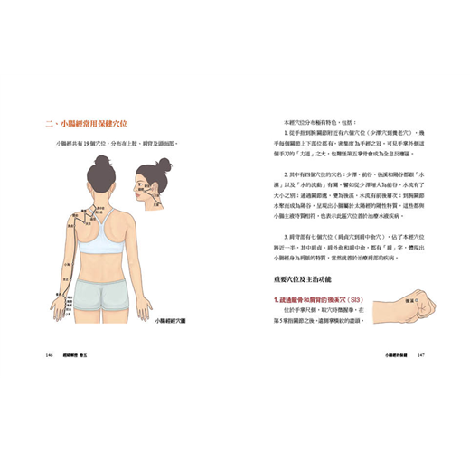 小腸經筋─病候特色 小腸經四大系統循行特色 保護心臟的禁衛軍 剛柔並濟的花木蘭特質 中醫師不傳之祕:乳突外張的臨床意義 中醫師不傳之祕:「落枕」的中醫臨床概念 中醫師不傳之祕:小腸經隱藏人體頭頸及手臂的旋轉關鍵 中醫師不傳之祕:養老穴善於處理身體旋轉與老化問題 小腸經的保健 一、平日的照護 二、小腸經常用保健穴位 重要穴位及主治功能