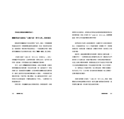 同理可推,其他臟腑也會出現類似情況。肺經連結胃,咳嗽期間若未注意飲食,食物飲品的寒氣也會循著經絡導致肺寒而加重咳嗽現象。因此《內經》有「五藏六府,皆令人咳」這種精闢論述,歷代以來為臨床醫師治嗽的明燈。