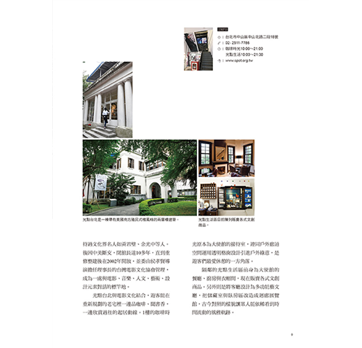 斜陽落疏影的時刻,讓「光點台北」各個方隅不管何時都散發著清雅自在的氛圍。這棟也稱做「台北之家」的古蹟,建於昭和元年(1926年),是一棟帶有美國南方殖民式樣風格的兩層樓建築,具有迴廊、中央走廊梯間、希臘廊柱等格局,盡顯簡潔雅致。曾做為領事館、海軍武官處以及美國歷任大使的官邸。
