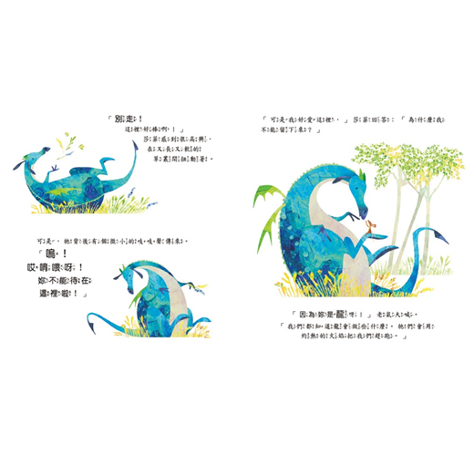 回到故事裡,劇情出現一大轉折,讓我們從心疼莎菲這個角色,轉而佩服起牠來──小動物們趕走心中畏懼的巨大噴火龍後,家園卻遭受到了真正兇惡的噴火龍群攻擊!這時尚未走遠的莎菲,並不因被拒絕而心懷憤恨,反而挺身而出,趕走了可怕的惡龍群,勇敢地保衛了牠所認定的「朋友」們,最後還帶大家找到了一個新的美麗家園。這樣包容與勇敢的表現,讓讀者體會到愛和感動,而動物們自我反省後的致歉,也值得引導孩子借鏡,面對願意與自己真心結交的新朋友,伸出友誼的手永遠不嫌遲。