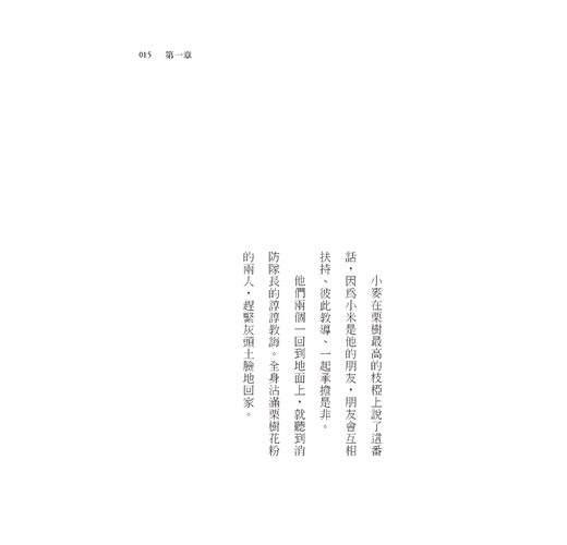小麥在栗樹最高的枝椏上說了這番話,因為小米是他的朋友,朋友會互相扶持、彼此教導、一起承擔是非。