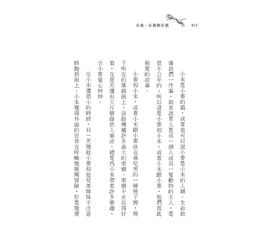 在接下來的故事裡,各位會看到小米的奇特命運。要是換成其他動物,恐怕就是一生的艱苦磨難,但小米卻經常發出代表好心情的呼嚕聲。當牠跟其他貓咪一樣,帶著貓科動物特有的神祕氛圍離我們而去時,我們心目中的小米,總是一臉幸福的樣子。
