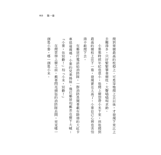 在爬雲梯上樹之前,戴著閃亮頭盔的消防隊長問,究竟哪一個是小麥,哪一個是小米。