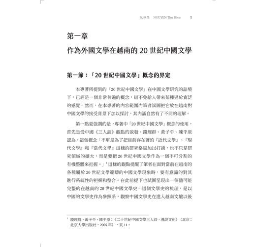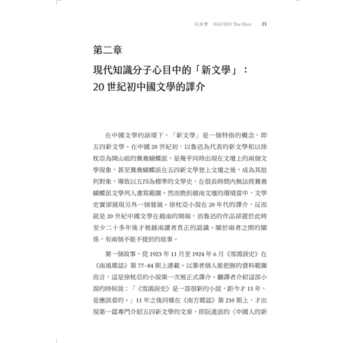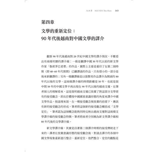 阮秋賢教授現任教於河內國家大學下屬社會科學與人文大學文學系,作為一位研究中國現代文學的專家,越南學界對中國現代文學作品的傳播狀況,她有十足的掌握,並能精熟地運用文學理論來闡明中國文學被譯介的細節。阮老師以精確、流暢、清楚的文字,帶領讀者追隨文學傳播的足跡,暢遊中越歷史文化。