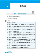 【本書適用】這本《郵政法規大意及交通安全常識》適用於中華郵政(郵局)招考專業職(二)外勤郵遞業務、運輸業務類科 對於郵件處理規則感到陌生嗎?該怎麼跟郵政法連結起來? 考場作答腦內一片空白無法思考?面對相似的名詞游移不決嗎? 罰則千奇百怪,罰金罰鍰搞不清楚?以上對於條文數量繁多的郵政法規及交通安全常識理解不夠通透的問題,三民輔考老師都知道,這本書將帶您解決困惑,取得高分!本書試圖將法規內容拆解成數個主題加以論述,輔以歷屆試題演練的方式,幫讀者排除這些應試障礙。【本書優勢】一、最新修法近二年來,本科考試範圍的法規陸續修法,包含郵政法、郵件處理規則、道路交通安全規則與交通管理處罰條例皆大幅度修法,相信不少考生備考備到開始懷疑人生!本書精心將近年新修法重點分點分項進行整理,置於每章首要主題。考生先對新修條文內容有所認識,再進行內文研讀,就能達到事半功倍的效果。考試前再利用此部分,快速複習,加深自己的印象,就可加快判斷選項的時間,上榜絕非難事!二、條理分明本書將法規內容分為數個主題,層次分明,梳理法規脈絡,緊扣命題範圍進行章節安排。詳實呈現法條內容,後緊接精選試題,讓考生不僅看懂條文,也可立即破解題目選項!本書內文並穿插相關大法官解釋,在概念融會貫通下,獲取高分輕而易舉。三、一望即知常言道:法規內有數字,就是出題的關鍵!尤其郵政法與道路交通管理處罰條例中有許多相似的罰則,很難完整區分。本書特別繪製精美表格,將罰則與處罰事由相連結,讓考生既背了罰則也知為何處罰,知其然且知其所以然,理解自然事半功倍。讀透罰則表格,就可以加快選項判斷,節省作答時間。四、重點凸顯本書採雙色印刷,選擇題答題關鍵字以藍色標記,利用黑白藍三種色調,進行系統性學習。多一種顏色,多一道區隔,就是要使龐雜的郵政法規及交通安全常識,在讀者腦海中更見清晰。【準備要領】一、熟記常考法條細節從歷年試題分析中可知,本科目需要考驗讀者仔細判斷法規的細節,例如法條中的「得」跟「應」意義完全不同。「罰金」及「罰緩」必須要區分清楚。「主管機關」、「擬訂機關」與「核定機關」什麼事項歸誰管,規則由誰訂,以及需要哪個機關同意,要記憶到一字不差。二、勤做考古題本書收錄三回模擬試題及歷年試題,題題皆有名師精闢解析,勤做演練與複習,不僅能快速了解考試出題方向,針對答錯的題目加強複習及瞭解,充分達到演練效果,熟能生巧,考場應試便能輕鬆迅速且正確的填寫答案。【考生上榜心得1】上榜生:黃子豪我報考的是郵遞業務專業職(二)外勤這個類科,買函授的課程在家中用電腦看影片,總共看了三次影片,第一次先打基礎,第二次當複習,最後一次是依照自己的方式,邊讀邊聽老師上課。國考是一條不歸路,何時會上榜真的沒有把握,但是心理建設很重要,要對自己有信心,家人的支持及鼓勵也是一大原因,抱著必上榜的決心看會不會激發潛能,終於如願以償的錄取。希望大家都能朝自己的目標努力,祝大家都能金榜題名。郵政法規及交通安全常識的部分,我覺得默寫一遍相當重要,能夠有效地加深印象,幫助輸入長期記憶裡。法規的部分我花比較多的時間,畢竟有背有分,三民補習班也很貼心的有做出交通安全常識罰鍰金額的表格,讓我能有效率更快速的上手,這科是比較好衝刺的一科。【考生上榜心得2】上榜生:盧朋寬相對於現在的工作,郵局比較起來除較為穩定之外,國營事業的薪資及福利上,都比其他行業優渥許多,加上考科非常好準備,最重要的是本身喜歡在外頭趴趴走,因而決定報考郵局外勤。我覺得主要是三民輔考的學費不會太貴,師資方面優良,不會因為學費便宜而影響教學品質。極力推薦三民的函授課程,每位老師都是非常用心的教學,運用簡單且具系統性的例子幫助學員釐清所有問題,教材方面也是非常齊全,真的是受益良多。郵政與交通法規,一開始因為被太多法條給騙了,其實沒有很困難,把它統整到自己看得懂的筆記,每天帶在身邊讀~有背有分,從開始準備到考試,大概約2個月的時間,考完對完答案後,當下覺得自己應該有機會,隨即準備面試;每天對著鏡子及家人練習自我介紹,並且計算時間,希望可以控制在2分鐘,也利用時間上網查找郵局面試可能會出現的問題。