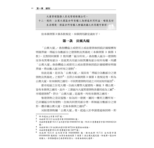 本條例實務見解的彙整過程中,相關法律爭議,多非本條例單一或數條文即可據以釐清。有關住戶權利義務、管理委員會執行職務的爭議,通常均涉及民法、行政法、建築法令、相關訴訟法規定和基本概念。因而,與其說本書為本條例之逐條釋義,其實更近似以本條例為綱所撰寫的居住生活法律專書。