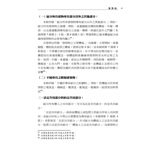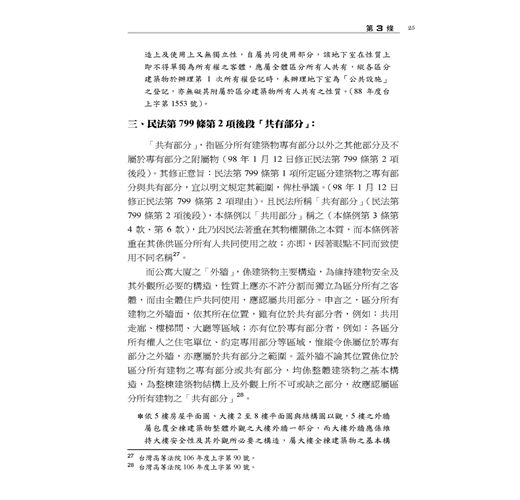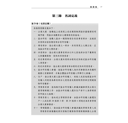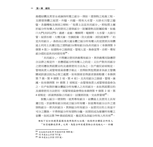 本書為各類實務見解的彙集,謹向在無數個案實例中,為釐清爭議和適用法律而案牘勞形的先進致敬;沒有他們的勤勉和用心,本書無以為憑。深盼本書的出版,能夠讓吾國公寓大廈規章制度、管理實務更上軌道,以期居住生活的法律爭議日益釐清,減少紛爭的擴大與綿延。