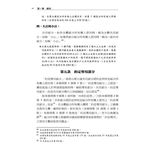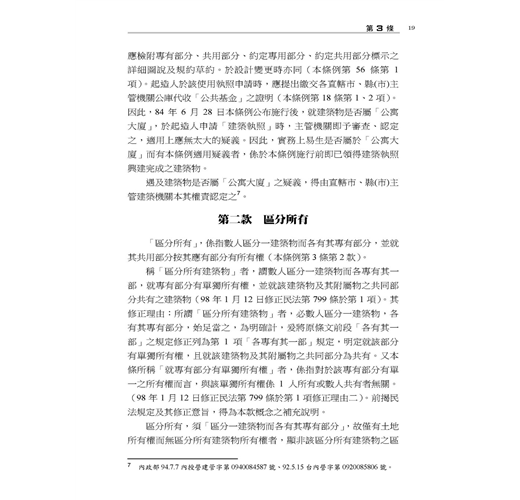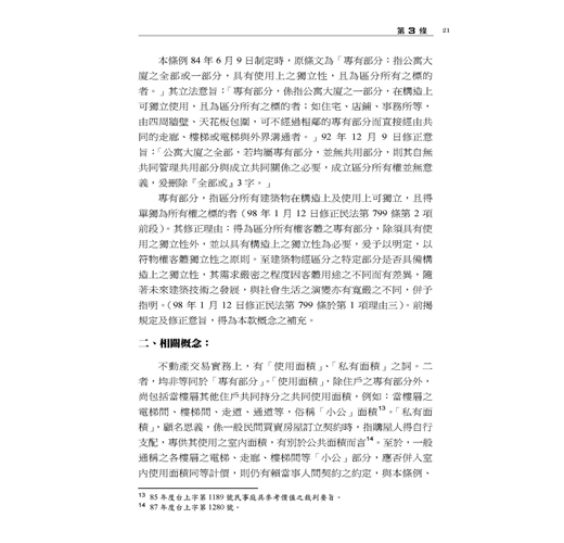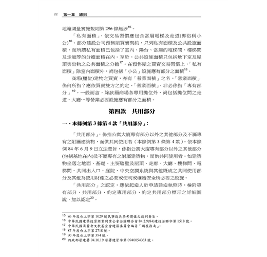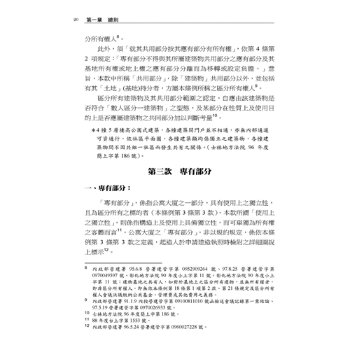 本條例各條文所依據之實務見解,主要以中央主管機關函釋及法院二、三審確定裁判為準。在各類名詞及概念的說明,儘可能維持原見解文字敘述;基於說明的條理,稍作彙整、增刪與潤飾。本書係就實務見解之歸納與分析所得,除部分見解歧異之處,稍作意見研討之外,多非個人立說創見。讀者先進於實例研討時,宜請於司法院、內政部營建署、台北市法規查詢等主要網站搜尋各類裁判函釋見解全文,亦可參考拙著「判解彙編」,以利理解。