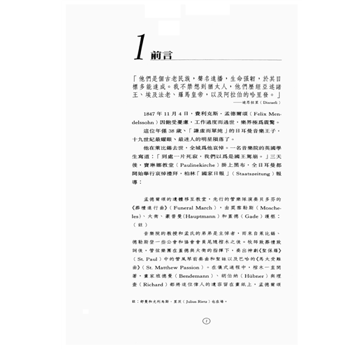 當費利克斯•孟德爾頌完成他的《仲夏夜之夢》序曲時才十六歲,舒曼讚譽道:「這部作品有年輕的才情。這位成熟大師在靈感飛揚時,首次展翅高飛。」他的這部少年傑作所得的評價與日俱增,甚至有學者認為,即使威爾第的歌劇《奧泰羅》或《法斯塔夫》都不能如此完整地捕捉到莎士比亞的真髓。對這位天才洋溢的音樂家,人們最津津樂道的大概就數他出身豪門,以及不虞匱乏的一生。其實,孟德爾頌家族的財富不過始於前兩代。費利克斯的祖父摩西出身低微,赤手空拳地來到普魯士的首都柏林打天下,成為聞名遐...