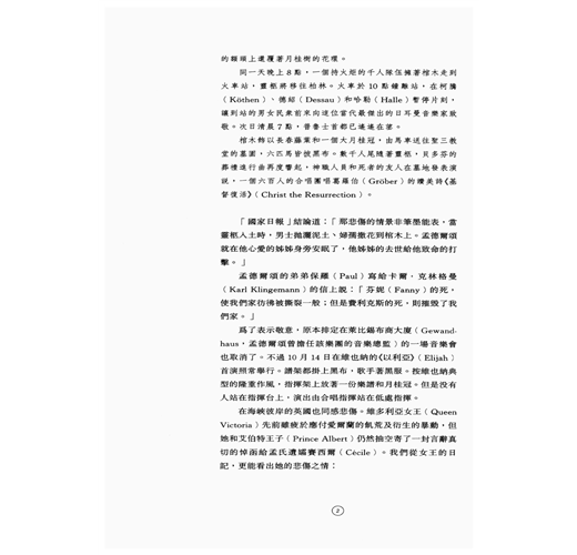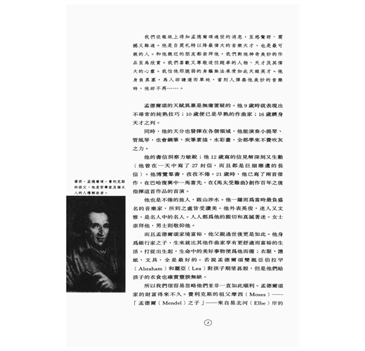 在這本傳記中,孟德爾頌的恬靜個性、對自身才華的自信、對大自然的熱愛,以及對姊姊芬妮的眷戀之情,在在躍然紙上。原作親切感人的筆風,雖然透過翻譯,讀來仍令人如沐春風。