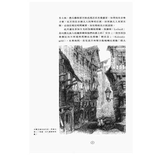 ……街道(或該叫做巷)狹窄,延伸有四分之一哩之長,高聳而髒亂的舊式房子夾道,不容馬車通過。它沒有交叉的巷弄,路的頭尾兩端各有一個強固的門,過了時間便不准任何人進出,否則便遭扣禁。據說有一萬人住在裡面,這麼多人住在這麼狹窄的地方著實令人難以想像。我(在一個入口處)看到他們衣衫襤褸地擠在一起,我想一定會有傳染病發生。晚上路口兩側都關閉之後,若發生火災,他們要如何逃生呢?