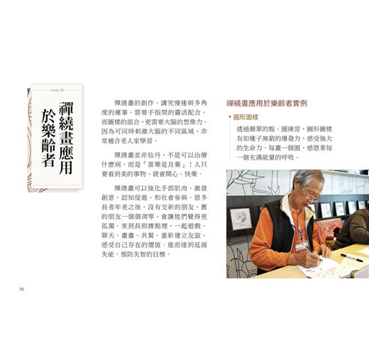 禪繞畫不需要草稿,也沒有規則,更不需要艱難的專業術語,只要運用簡單的圖樣就能組合出獨特的作品,所以銀髮族也能輕鬆上手,並可藉由禪繞畫帶他們手腦併用,達到舒壓放鬆的效果。