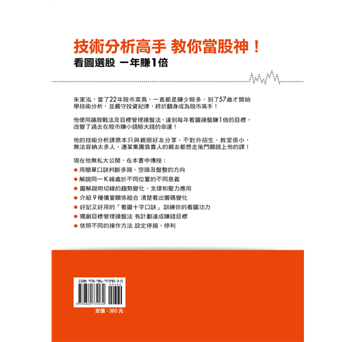 朱家泓,當了22年股市菜鳥,一直都是賺少賠多,到了57歲才開始學技術分析,並嚴守投資紀律,終於翻身,他使用飆股戰法及目標管理操盤法,達到每年看圖操盤賺1倍的目標,改變了過去在股市賺小錢賠大錢的命運!
