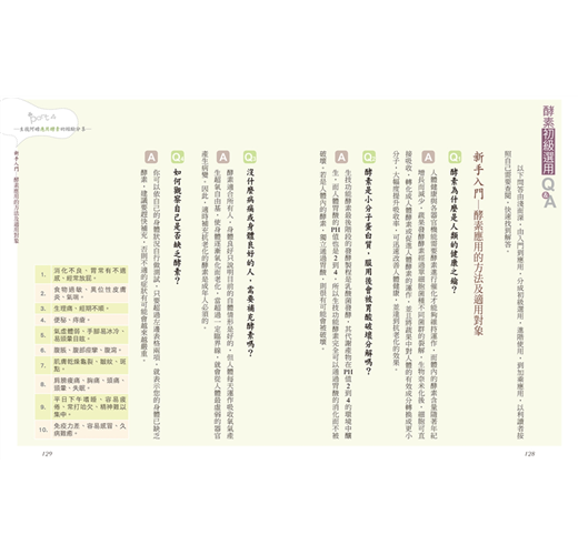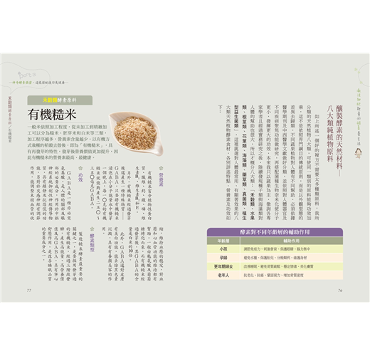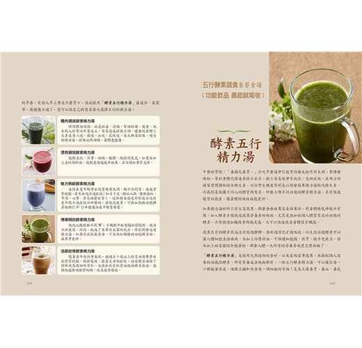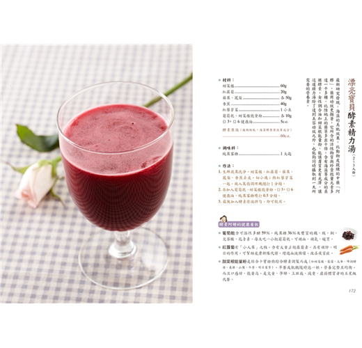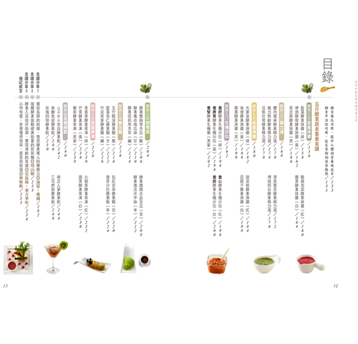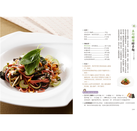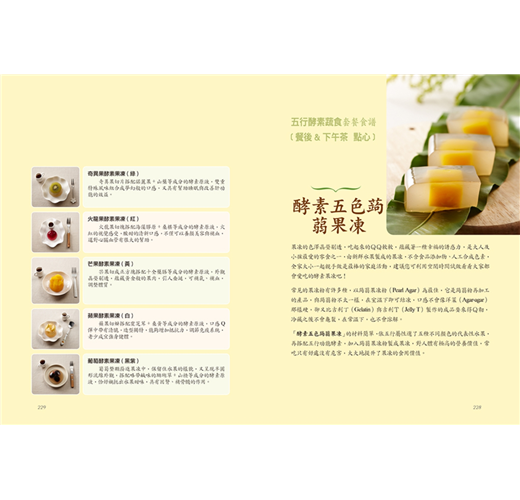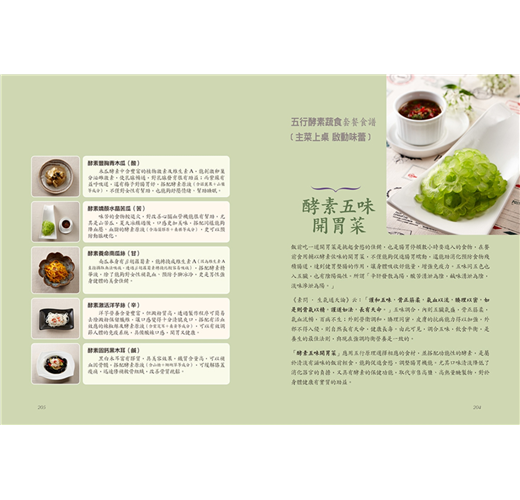 而且食譜中除了酵素外,更將常見市售、吃了會健康但一點都不好吃的營養保健品,如藍藻、啤酒酵母、大麥苗粉….等一起入菜,讓營養品成為餐桌上美味的料理,其中更帶入五行養生的概念與做法,讓蔬食走入更健康養生的新境界!