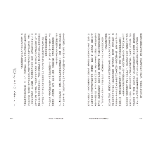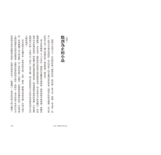 我在臺大哲學系的課以中國哲學為主,同時也教過十幾年西方哲學,如形上學、宗教哲學與西方哲學史的前半段(古希臘與中世紀)。另外則長期在洪建全基金會授課,為好學的民間朋友講述西方哲學。教西方哲學要做到讓人「聽得懂、想得通、做得到」,實在是不容易的事。我這一生都在如此挑戰自己,雖然辛苦,也得到許多快樂。快樂之一就是知道了西方哲學家的生平小故事以及他們雋永精妙的短語。現在我將這些資料寫成二○九篇短文與朋友分享。本書出版於二○一二年,現在由九歌出版社重編出版,看來大方清新,更增加了閱讀的樂趣。