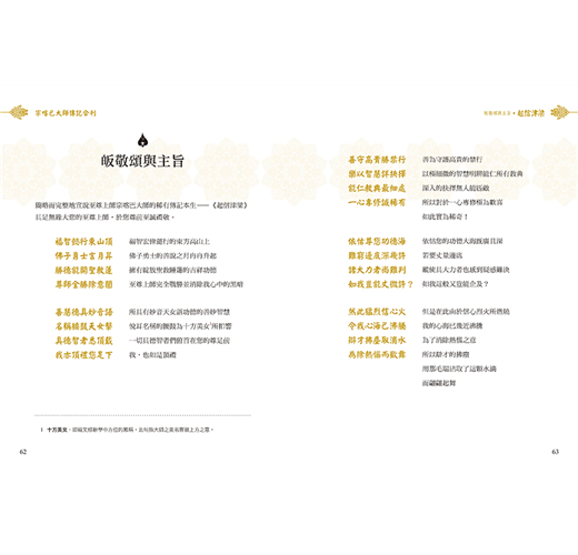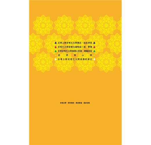 ◆ 全書收錄宗喀巴大師最權威且完整之五部根本傳記,由大師三位親傳弟子所著:(1)《起信津梁》、(2)《密傳寶穗》,由克主傑大師所著,記錄大師從出生至圓寂,一生佛行事業功德,以及密法修行之成就。(3) 《傳記附篇》由文殊海大師所著,為《起信津梁》之補充。(4)《清淨雪山頌》,克主傑大師所著,宣說大師未來成佛之情形。(5)《密傳祈請文》,由妙音法王所著,為偈頌體傳記,如史詩般總攝大師一生功德。