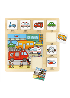 交通工具木製拼圖共有九片拼圖,並有著精緻的場景,場景裡面有許多交通工具,小朋友可依據四周的七片交通工具認知卡的提示,找出場景裡面的車輛,進行認知、學習英文,有著多重教育的功能。