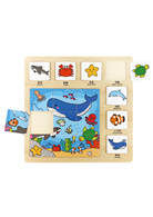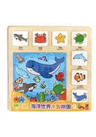 海洋世界木製拼圖共有九片拼圖,並有著精緻的場景,場景裡面有許多海洋生物,小朋友可依據四周的七片海洋生物認知卡的提示,找出場景裡面的海洋生物,進行認知、學習英文,有著多重教育的功能。