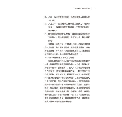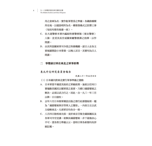 觀十五日之記載,日本對於中國以武力侵略, 九一八事變之具體方策已定矣。尚有一可記之事,其事雖不屬於軍事範圍,然為世界外交家所知者,頗可為日人應負九一八事變責任之一證;即九月十三日東京朝日新聞記事,日本出席國聯代表芳澤大使於九日國聯會席上說明:「國家自衛權之保留,與聯盟規約及非戰公約調和,而不相背。」其用語及地名國名,已明示在中國東北將有軍事行動之企圖意味矣。中國代表施肇基於十一月總會曾將此意隱密揭明,並要求各國對此加以預防及制裁,否則非戰條約將成空文云云。