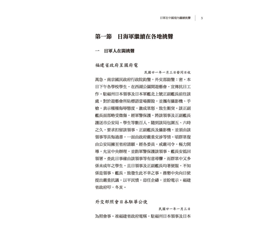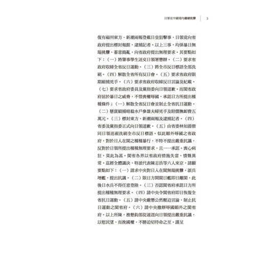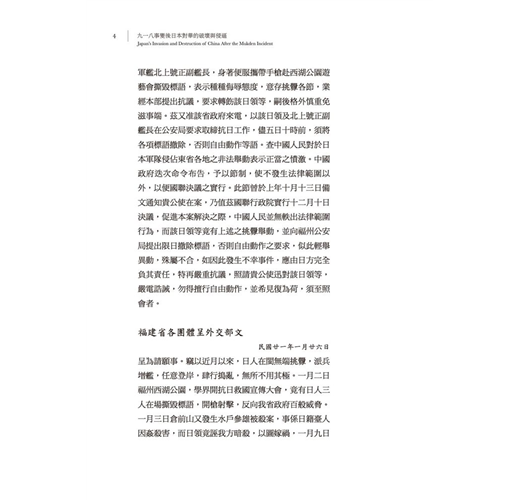 九一八事變之後,日本侵華腳步未曾停止,所謂「得寸進尺」差可形容,本書所輯資料,重在日軍繼續挑釁(1932-1933)、日軍暴行與中國損失(1931-1933)、日本在東北破壞中國行政權完整(1932)。