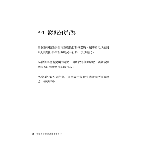 Ex.當個案會有尖叫問題時,可以教導個案唱歌、朗誦或數數等方法逐漸替代尖叫行為。