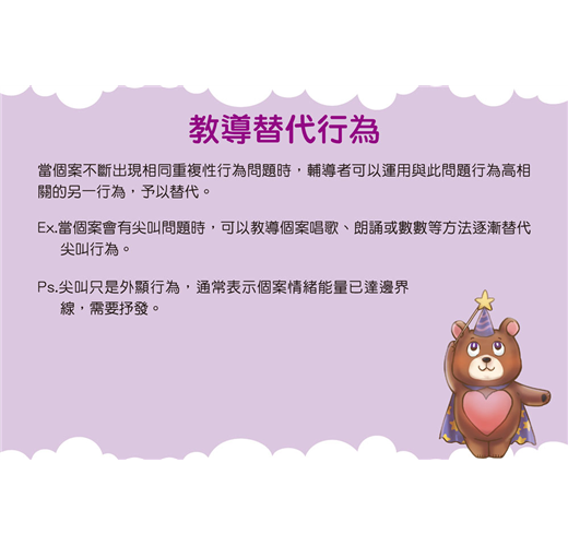 當個案不斷出現相同重複性行為問題時,輔導者可以運用與此問題行為高相關的另一行為,予以替代。