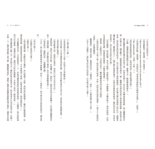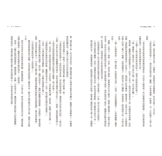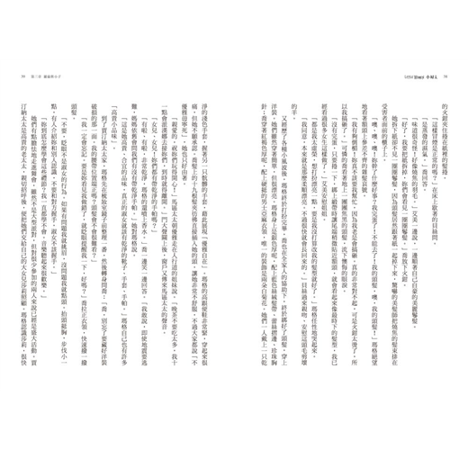 「我才不是!如果盤起頭髮就算淑女,那我到二十歲前都要綁兩條辮子。」喬一邊大叫,一邊扯掉髮網,甩了甩她的栗色長髮。「我不想長大變成馬區小姐,穿長裙,像個端莊的陶瓷娃娃!身為女生已經夠讓人不開心了,我喜歡男生的遊戲,男生的工作,男生的生活!我很失望自己不是男生。現在更糟,我多想和爸爸一起去打仗,卻只能像無聊的老太婆在家打毛線!」