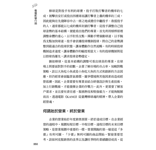 《看電影學管理》一書受到讀者的熱烈迴響,再加上眾多讀者反映可以從中更深入了解單元的奧妙所在,從縱切面探討管理學中的單元。故筆者選擇以「行銷管理」作為開端,沿用欣賞電影學管理的方式學習行銷。《看電影學行銷》書中,以「行銷管理」作為開始,「始於營業、終於營業」為結束,運用大量的案例作為行銷主題的研討(如下表)...