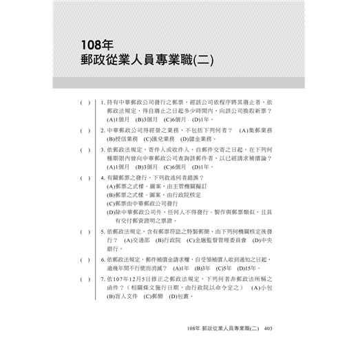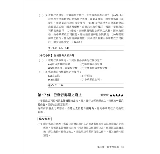 驗亦豐富的高階主管所親自編撰,其對命題委員的思路、習性、業務熟稔度及其可能的試題佈局可說瞭若指掌,因此能掌握命題的範疇,以及每個法條所可能出現的關鍵字句(Key Words)所在,因此本書的編寫能夠為考生有條理的解析各個常考的郵政法條重點。
