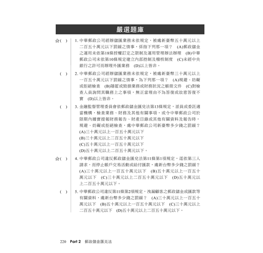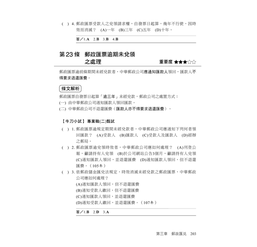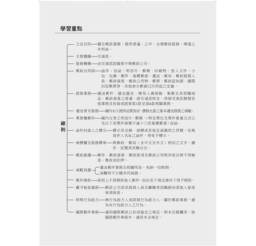 法規完整收錄,並且逐條附有條文解析,不用再另行準備一份條文比對書本內容。再者,為免誤導考生,將本書中所有的課文內容及各種考試歷屆試題,都以最新(已經修正的條文及概念)的規定及概念加以更新。例「中華(台灣)郵政公司」一律修改為「中華郵政公司」;「行政院金融監督管理委員會」一律修改為「金融監督管理委員會」等。此外,作者就郵政法規若干條文中的「立法精神、立法旨意或關鍵概念」,考生較易混淆或不明瞭之處,在全書相關地方以「名師講堂」、「概念探索」、「概念補給站」或「表列整理」