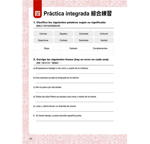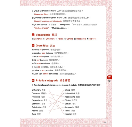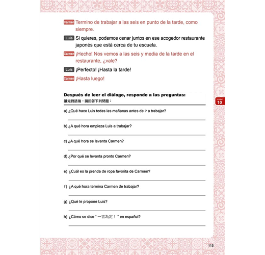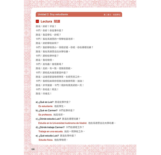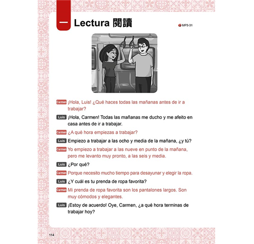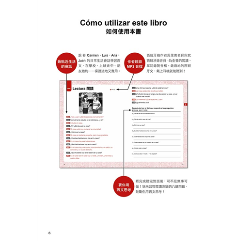 Step 1 閱讀:以在臺灣生活的Carmen、Luis、Ana、Juan為主角,共16篇的日常會話。不只能訓練西文閱讀能力,還是最貼近生活經驗、最能夠活用的真實內容。閱讀最後附有閱讀測驗,檢視自己是否讀懂外,也訓練你用西文思考。例: