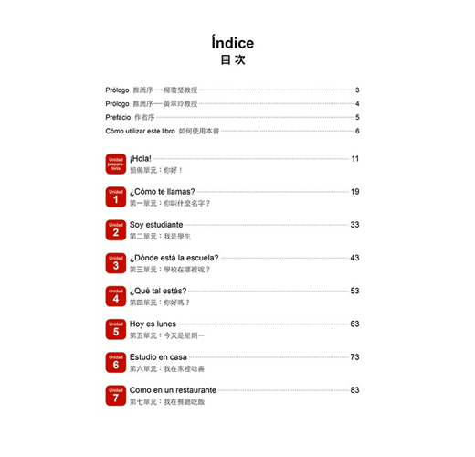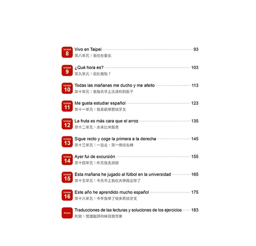 此書共有16個單元,包含國籍、職業、學校、方位、天氣、日期、西班牙菜餚、家庭、顏色、休閒活動等生活用語,活潑生動並將大部分的中文翻譯置於附錄,以期打造一個理想的西班牙文學習環境;簡潔的講解與實用的例句,更引領學習者了解句型以及真實意思;並透過閱讀翻譯和練習題,讓學習者能掌握學習西班牙文的訣竅。