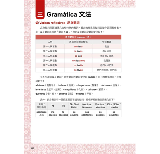 Step 3 文法:最令人頭痛的文法,本書也有辦法讓你輕鬆吸收!初學者必學的文法:「-ar」動詞、「-er」動詞、「-ir」動詞、現在直陳式、命令式、過去簡單式、過去完成式、疑問代名詞,也依照相應的主題,安排在各個章節。小份量的內容,讓吸收更加容易;與主題貼合的編排,能馬上對照使用情境。例:
