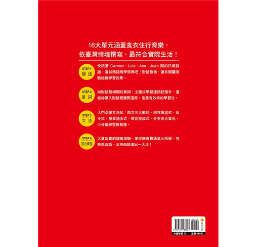 本書的架構主要分為16個單元,與日常生活有關。每個單元皆以中西文對照撰寫,内容包含相關閱讀、單詞、文法解說和有趣又實用的練習題,皆特別為中文母語者設計。此書的附錄含西班牙文基本文法、各單元聽力逐字稿、閱讀翻譯和練習題答案,提供更完整的學習內容。另外,本書附MP3音檔,能讓大家多聽每個單元的單詞和聽力內容,所有音檔皆由西班牙文母語者錄音。想要更深入瞭解西班牙文學習祕訣的臺灣朋友們,若想以輕鬆和有趣的方式從零開始學西班牙文,這本書將會是你們的好幫手!