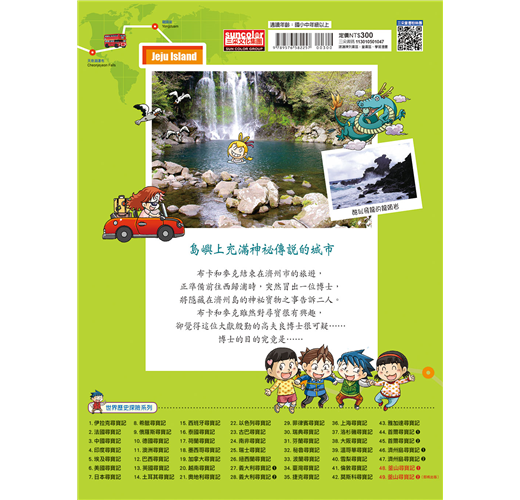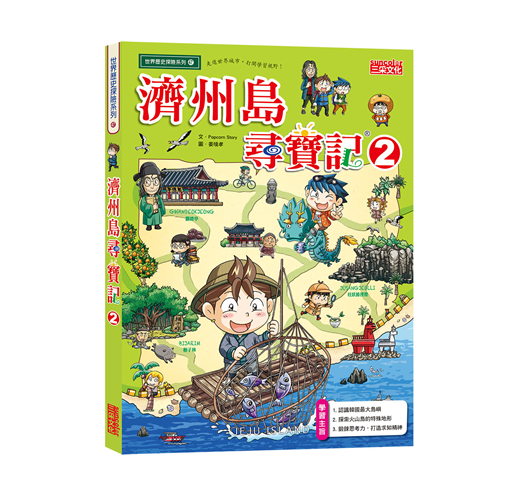 國家尋寶記中因為缺少了《韓國尋寶記》而受到許多孩子的詢問,作者都聽到了!除了規劃了首爾尋寶記外,姜老師特別加畫了兩集濟州尋寶記。濟州是韓國最大的島嶼,也是韓國人最喜歡的度假勝地,但同時濟州島也是亞洲的觀光勝地。濟州島上豐富的地形與生態,已經名列世界自然文化遺產,濟州世界自然遺產中心更是韓國唯一一座以UNESCO世界自然遺產為主題的博物館。因應著有別於朝鮮半島的地理位置而發展出有別於韓國本島的文化習俗,讓布卡與麥克帶著孩子紙上走訪,有助於了解這個特別的島嶼。