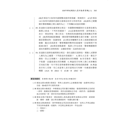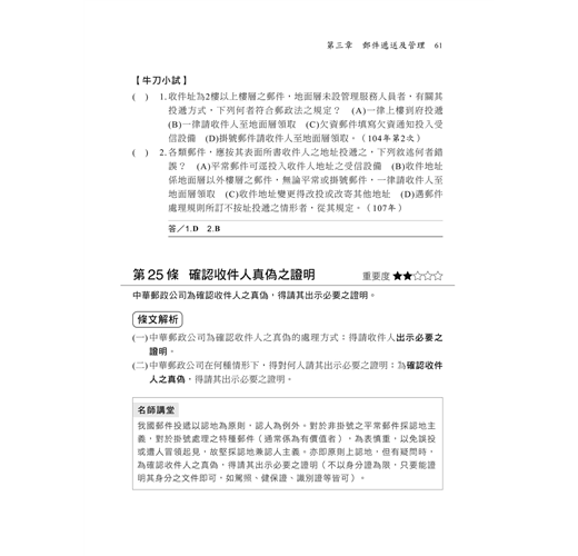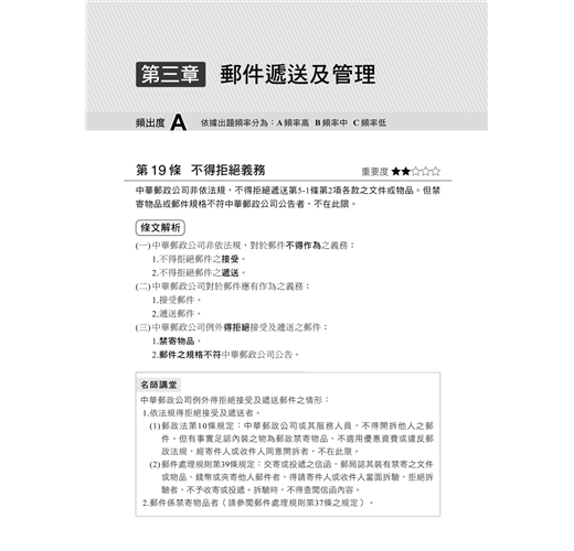 一、《郵政法》、《郵件處理規則》、《道路交通安全規則/第四章》、《道路交通管理處罰條例》及《道路交通事故處理辦法》都是依序由第1 條開始臚列條文,緊接著進行該「條文解析」。若有些條文需進一步說明其立法旨意,或須加以介紹概念,使讀者完全明瞭的地方,則以名師講堂等方式,加以敘述。如此不但可節省書本篇幅,考生也毋庸看些不相關的資料。
