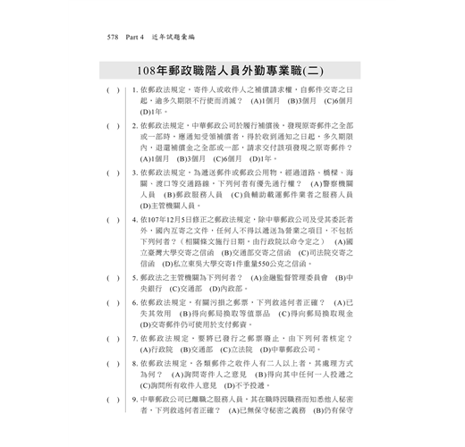 書末近年試題彙編收錄近年郵政考試試題及解析,可節省您相當多的時間蒐集試題,是檢驗自我實力、掌握出題趨勢的最佳幫手,使您直搗命題核心。