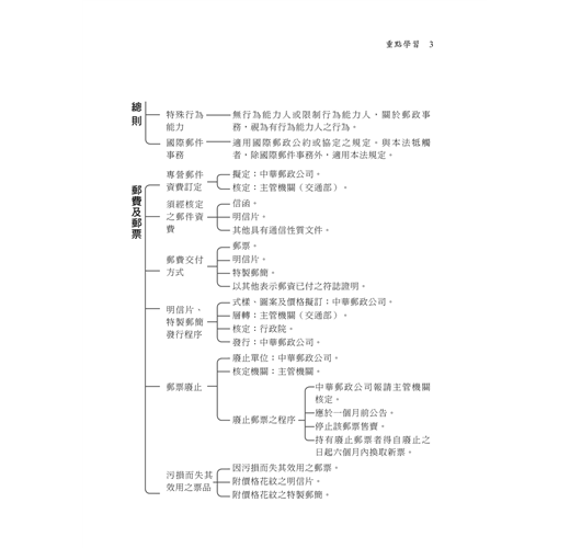 本書採主題式分類設計。將郵政法歸大意與交通安全常識必考法規分成不同主題,各部分最前面附有樹狀圖,將法規體系清楚列出,讓您立即掌握法規特點,快速建立基礎架構。此外,於每一部分附有頻出度,更可方便讀者分配讀書時間。