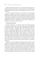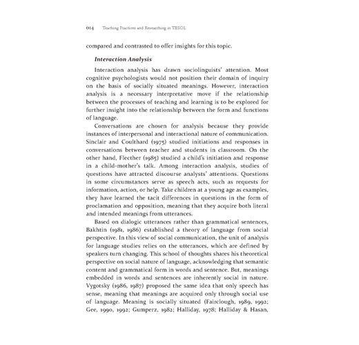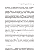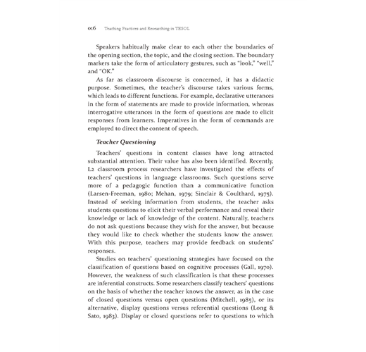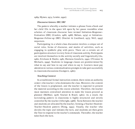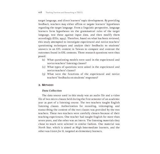 第一篇文章研究在聽力課堂上訓練外文系的碩士生做示範教學兩堂聽力課中,身分為資深教師和新任教師(皆為碩士生),在教學進行中,師生透過問題的互動研究。從資深老師和新任教師看出提問技巧的不同,分別在何時問問題,如何問問題(guided questions),這些問題又如何影響學生聽力的理解和表現。結果發現資深最常問「Wh-questions」,新任教師最常問「Yes/No questions」。資深教師經常應用學生的回饋進行「理解確認(Comprehension checking)」和「問題延伸(expansion)」;新任教師經常直接給評語和重複學生的回饋意見。當然這篇文章中的研究對象和他們的表現是否具代表性不能直接引伸為台灣職前教師教聽力的普遍現象。但本研究的主要目的是將師生課堂的言談溝通課堂視為社會行為;教師的提問將會決定學生的言談行為的表現。
