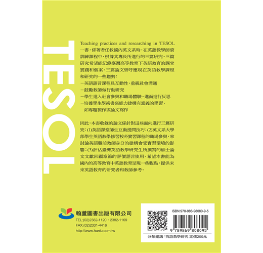 Teaching practices and researching in TESOL一書,係著者任教國內英文系時,在英語教學師資訓練課程中,根據其專長所進行的三篇研究。三篇研究希望能記錄臺灣高等教育下英語教育的課堂實踐和個案紀錄。三篇論文皆呼應現在英語教學課程和研究的一些趨勢: