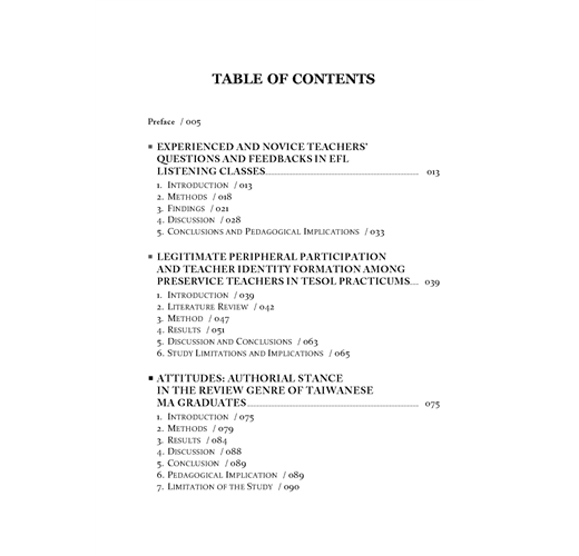 因此,本書收錄的論文係針對這些面向進行三篇研究:(1)英語課堂師生互動提問技巧;(2)英文系大學部學生英語教學修習校外實習課程的職場參與,來討論英語職前教師身分的建構會受實習環境的影響;(3)評估臺灣英語教學研究生所撰寫的碩士論文文獻回顧章節的評價語言使用。希望本書能為國內的高等教育中英語教育呈現一些觀點,提供未來英語教育的學習者和教師參考。