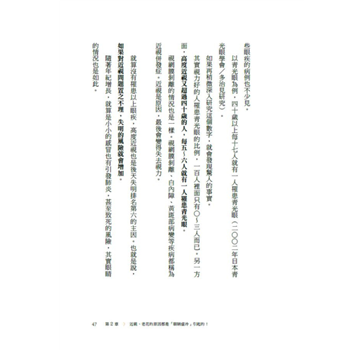 以青光眼為例,四十歲以上每十七人就有一人罹患青光眼(二○○二年日本青光眼學會 多治見研究)