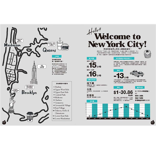 帶領你暢遊24小時的旅遊導覽書她,是一個兼具多方面貌的城市。若是提到「國際大都會」這個名詞,她的一切條件絕對都當之無愧。她不僅是該國規模最大的都市,也是世界政經、文化、娛樂等領域的代表性地域。其知名度之高,甚至經常讓一些人誤以為她才是美利堅合眾國的首都。她,就是有著「大蘋果」這個可愛暱稱的紐約。