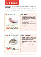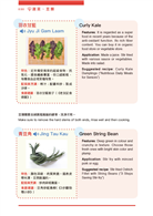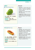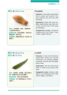・ 材料介紹包括特色、選購貼士、處理方法、適宜配搭的食材、適宜烹調的方法及建議食譜,以清晰的文字令家傭全面認識材料。