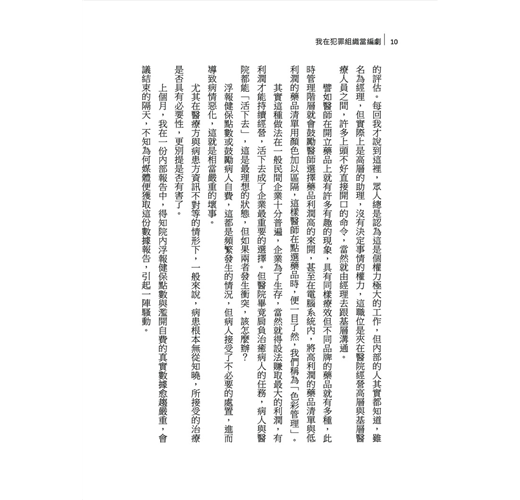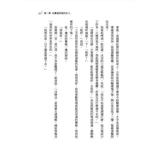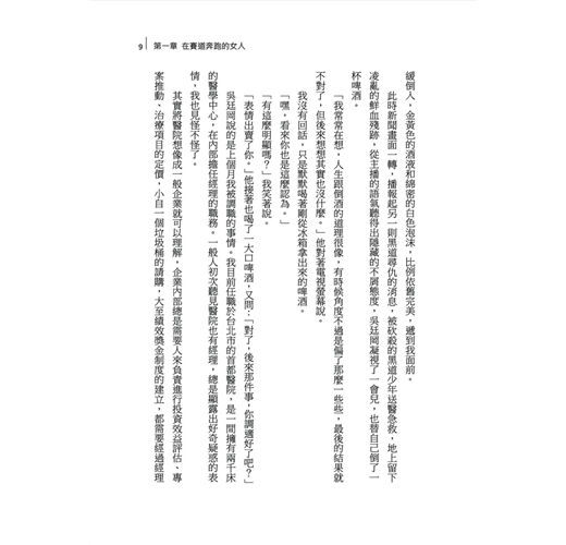 吳廷岡說的是上個月我被調職的事情。我目前任職於台北市的首都醫院,是一間擁有兩千床的醫學中心,在內部擔任經理的職務。一般人初次聽見醫院也有經理,總是顯露出好奇疑惑的表情,我也見怪不怪了。